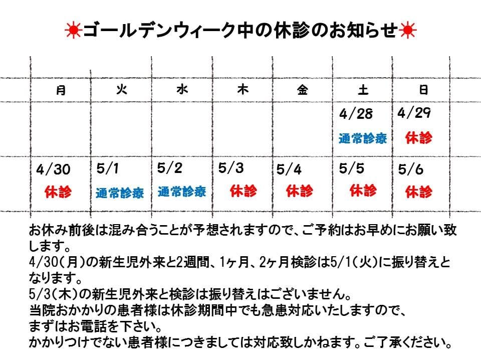 4/30(月)の新生児外来と2週間、1ヶ月、2ヶ月検診は5/1(火)に振り替えとなります。
