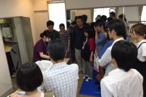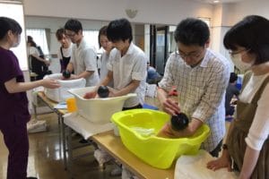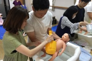 パパはオムツ替え、抱っこの仕方、ミルクの作り方を教わります!パパを見守るママ達、とっても幸せそうです♡