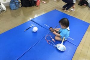 足型ブースでは、足の裏への刺激がくすぐったくて泣き出すお子さんもいました。