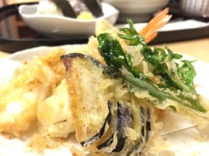 こちらは季節の天ぷらです。茄子、ごぼう、れんこん、エビ、イカ、そしてこの季節に大活躍の春菊も入っています。