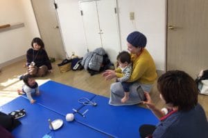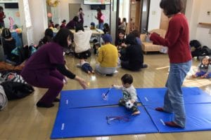 部屋に入ると、なれない環境にびっくりして泣き出す赤ちゃん達。ママの側から離れません。しっかりママに掴まった状態で周りを見渡して、少しずつ慣れていきます。