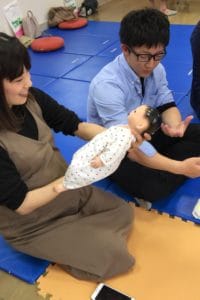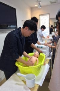 3キロほどの赤ちゃんの人形を使って沐浴体験もしていただきました。パパが指導係でママに伝えていらっしゃるご夫婦もいました(^^)