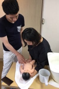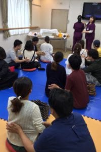 陣痛が始まった時にできるよう、マッサージの予行練習を皆さんにしていただきました。ママの好みをパパに伝授。
