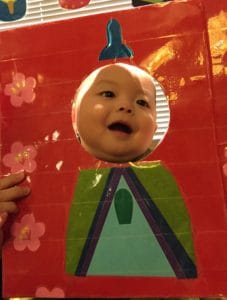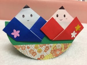 完成したのはこちら!折り紙と画用紙で作ったおひなさまです。手で押すとユラユラ揺れます。